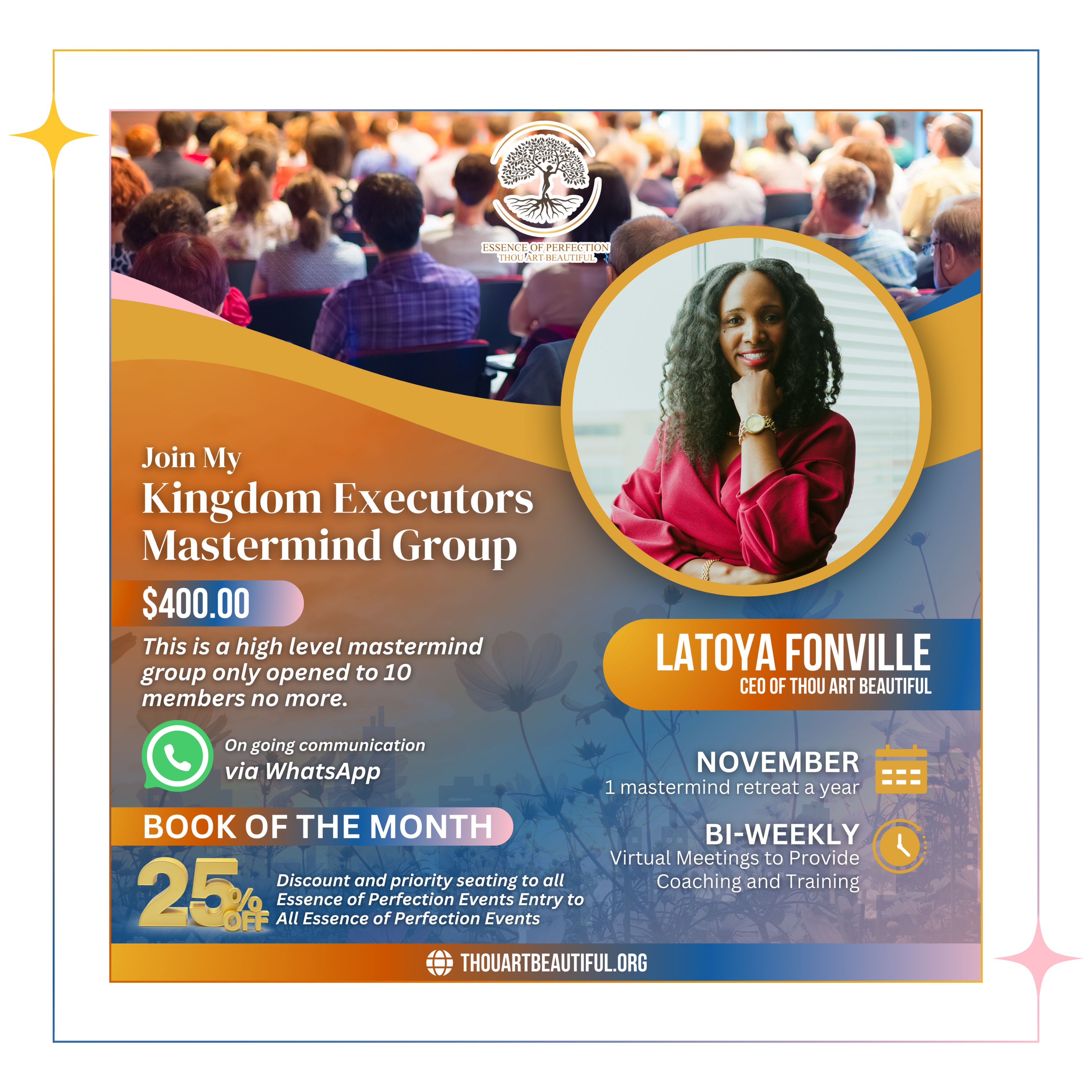 • 4 – 45 Minute Group Accountability Check-ins with LaToya. (During these sessions we will discuss the chapters covered that week and any challenges that you might be facing. Live coaching will be provided. All victories will be celebrated. 1 Guest Speaker who Operates in Kingdom Confidence.)